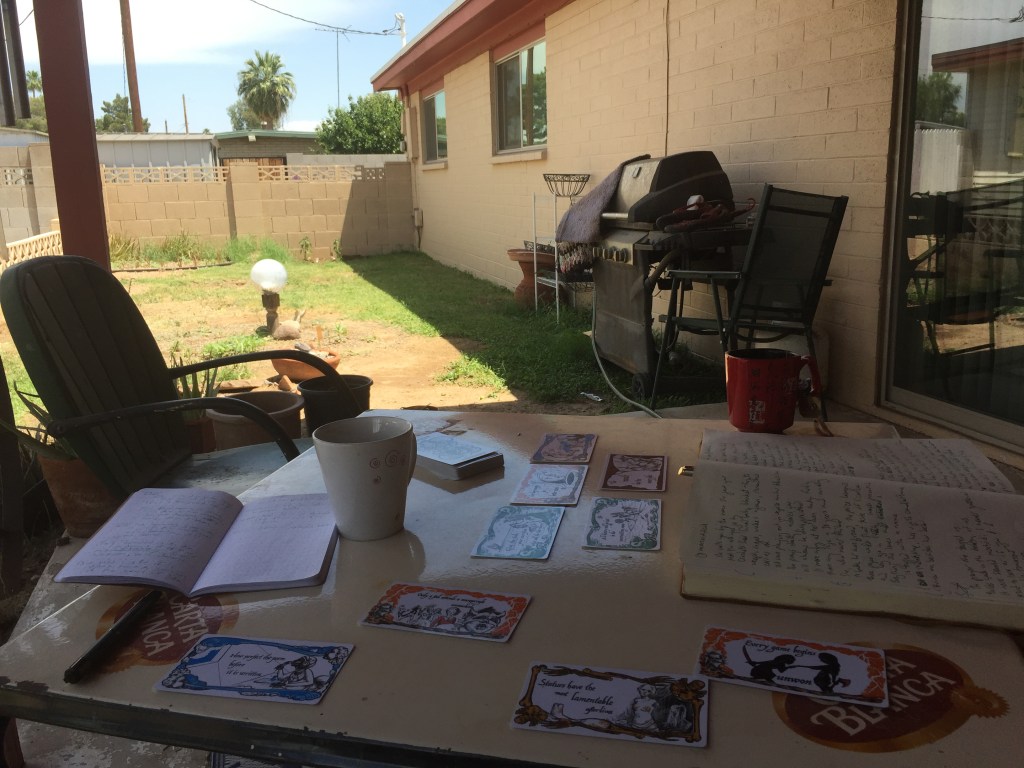 Claire and I are continuing to experiment with using the Negocios Infernales cards we created for a game as inspiration for writing. On Mother’s Day (May 10 2020) we started out the day by driving around Phoenix and handing out bouquets to the many mothers in our lives. When we got home, we headed for the front porch to meditate on mothers, the cards providing inspiration and spooky, all-too-on-the-nose guidance.