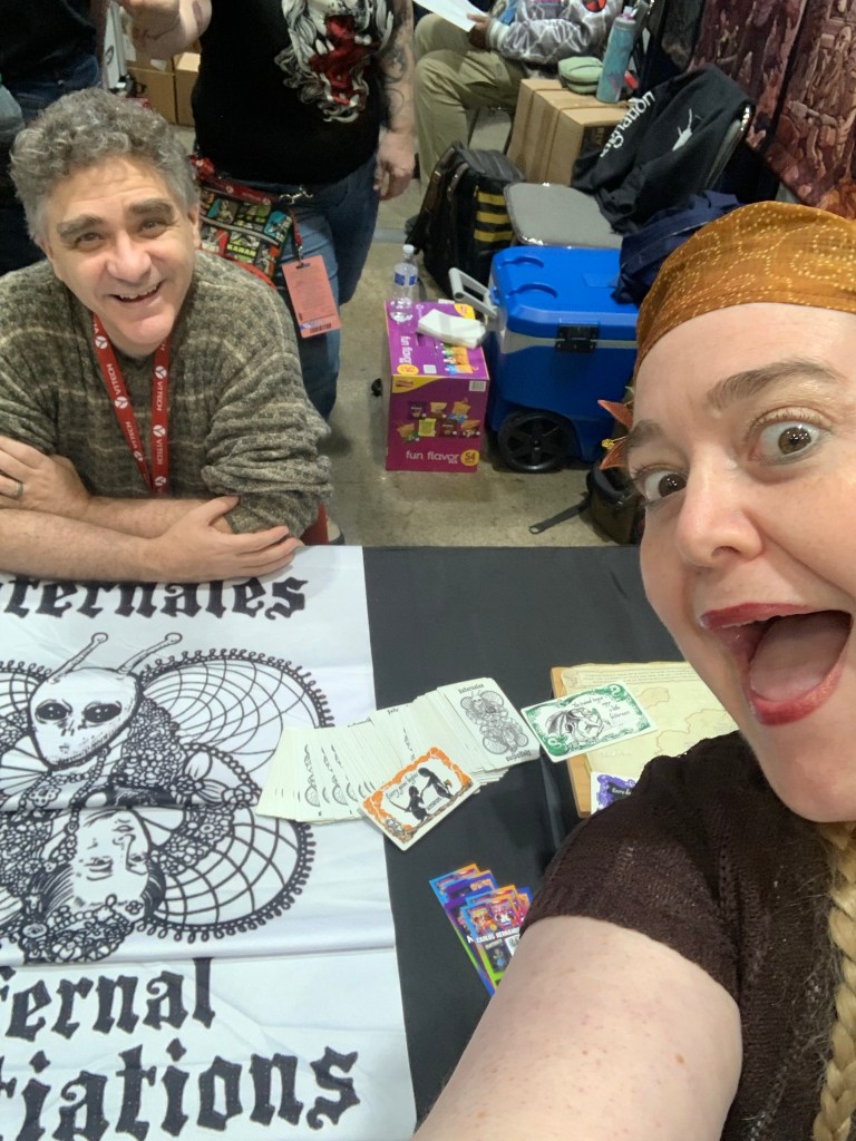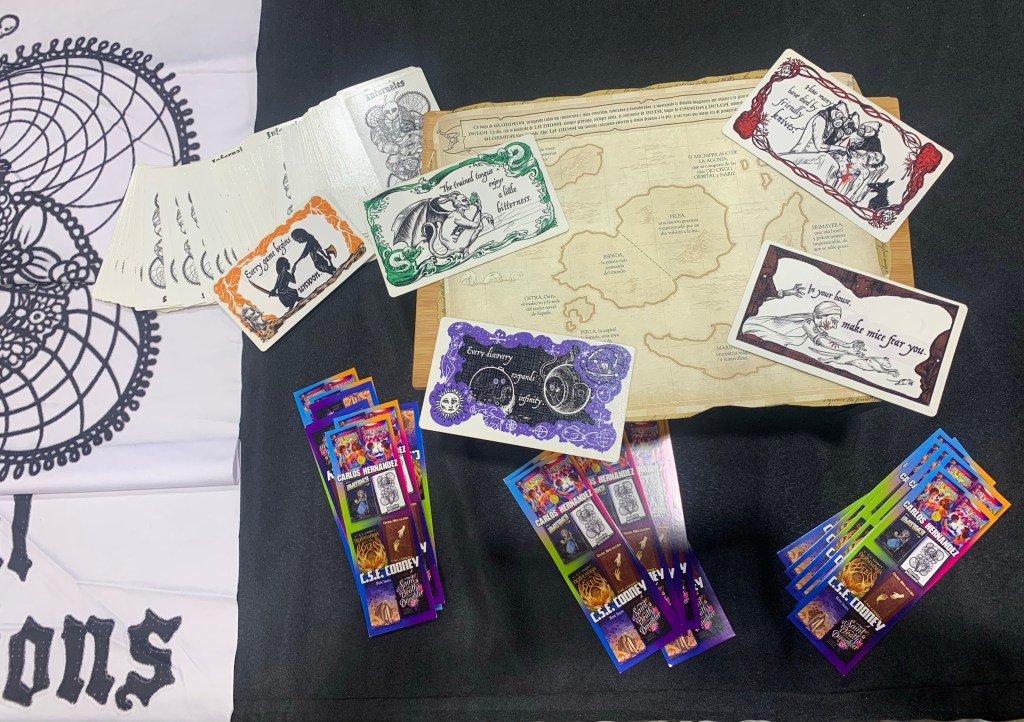 And we have free bookmarks! And we’ll “read” your future with the DECK OF DESTINY (la Baraja del Destino) from our forthcoming TTRPG NEGOCIOS INFERNALES.